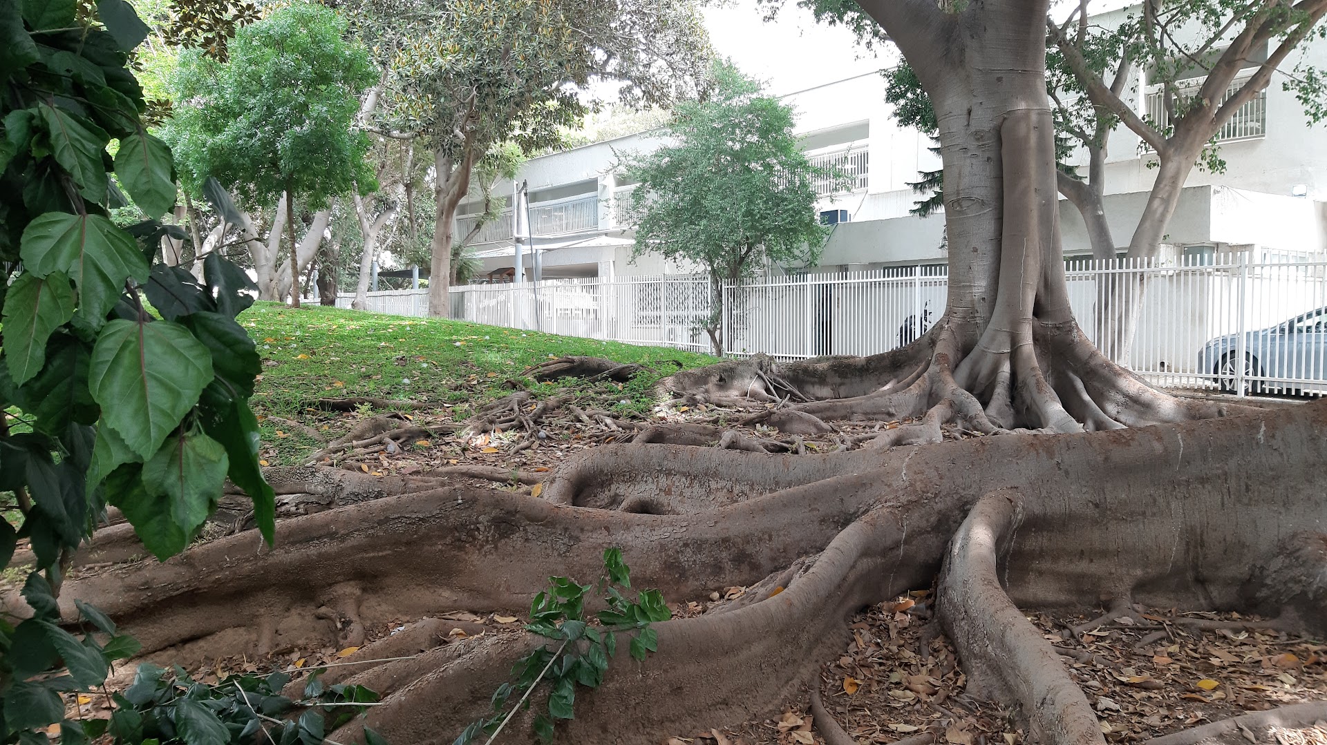 גינה מקסימה בלב העיר עצים גדולים עם שורשים ענקיים מסביבם